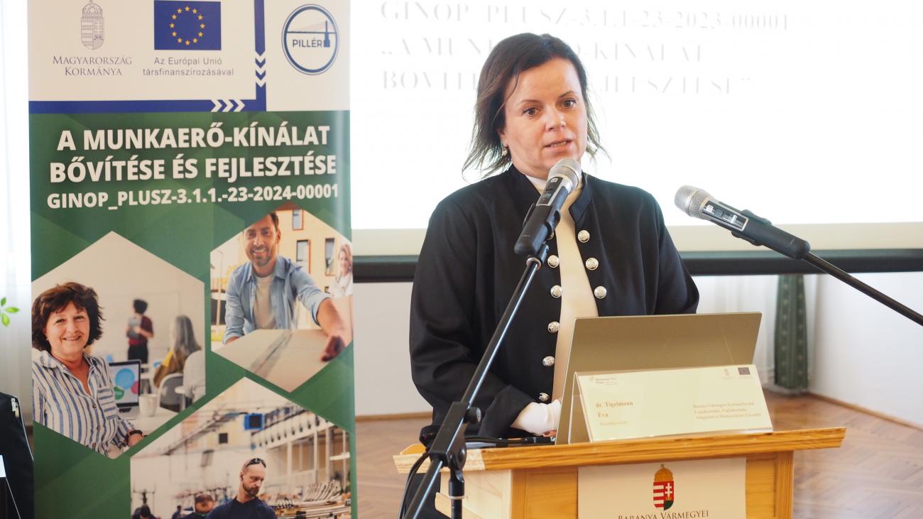 Dr. Tigelmann Éva, a kormányhivatal foglalkoztatási főosztályának vezetője bevezetőjében bemutatta a Gazdaságfejlesztési és Innovációs Operatív Program Plusz, GINOP_PLUSZ-3.1.1-23-2024-00001 kódszámú „A munkaerő-kínálat bővítése és fejlesztése” elnevezésű munkaerőpiaci programban elérhető támogatási lehetőségeket, valamint a projekt eddigi eredményeit. Mint elhangzott, a 30 év feletti álláskeresők elhelyezkedését segítő, 2029. augusztus végén záruló programban továbbra is rendelkezésre állnak az Európai Szociális Alap Plusz által biztosított, vissza nem térítendő támogatási formák, azaz a bértámogatás, a mobilitási támogatás, a képzéshez kapcsolódó, álláskeresést ösztönző juttatás és a foglalkoztatást elősegítő szolgáltatások ideje alatt igénybe vehető pénzügyi támogatás.