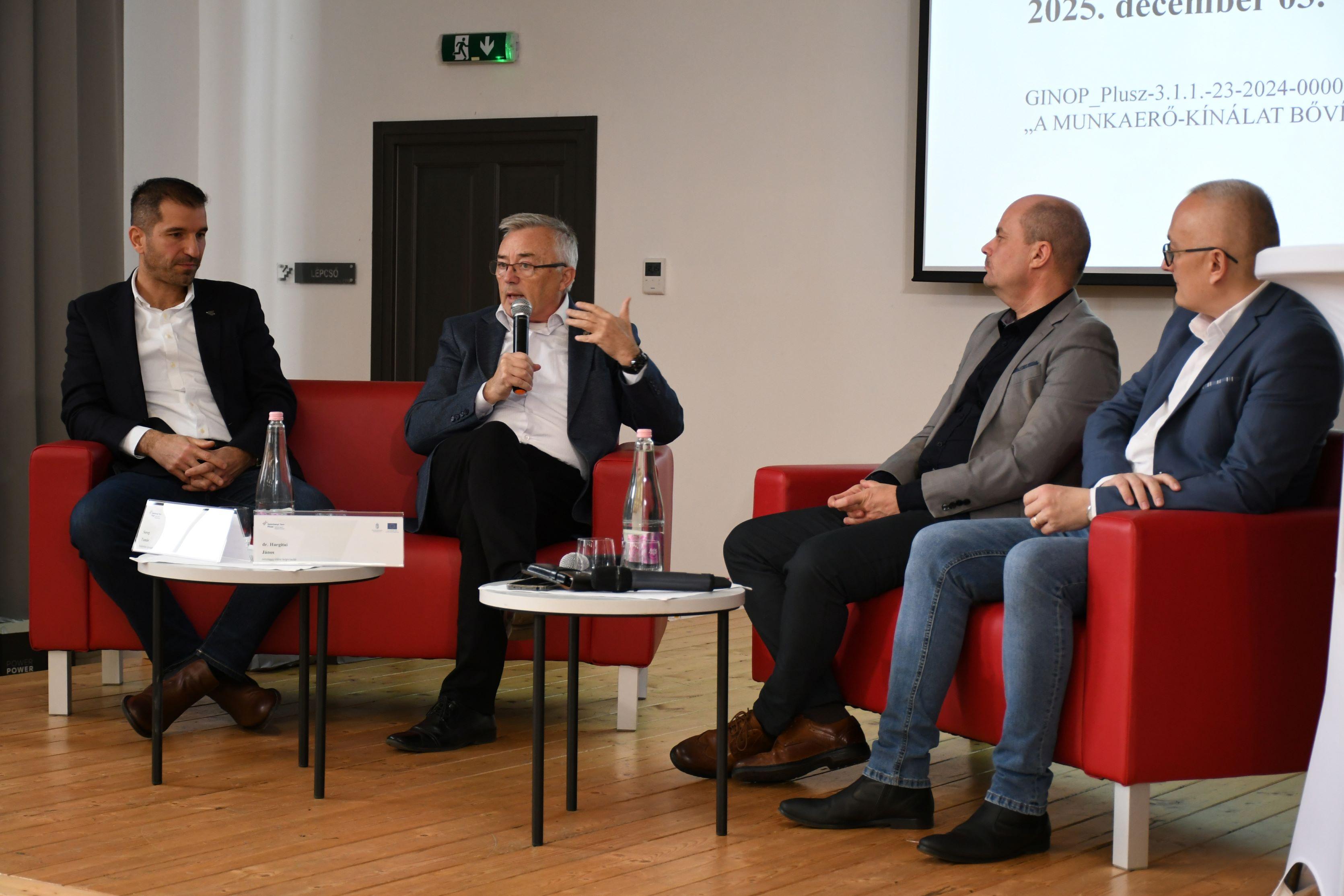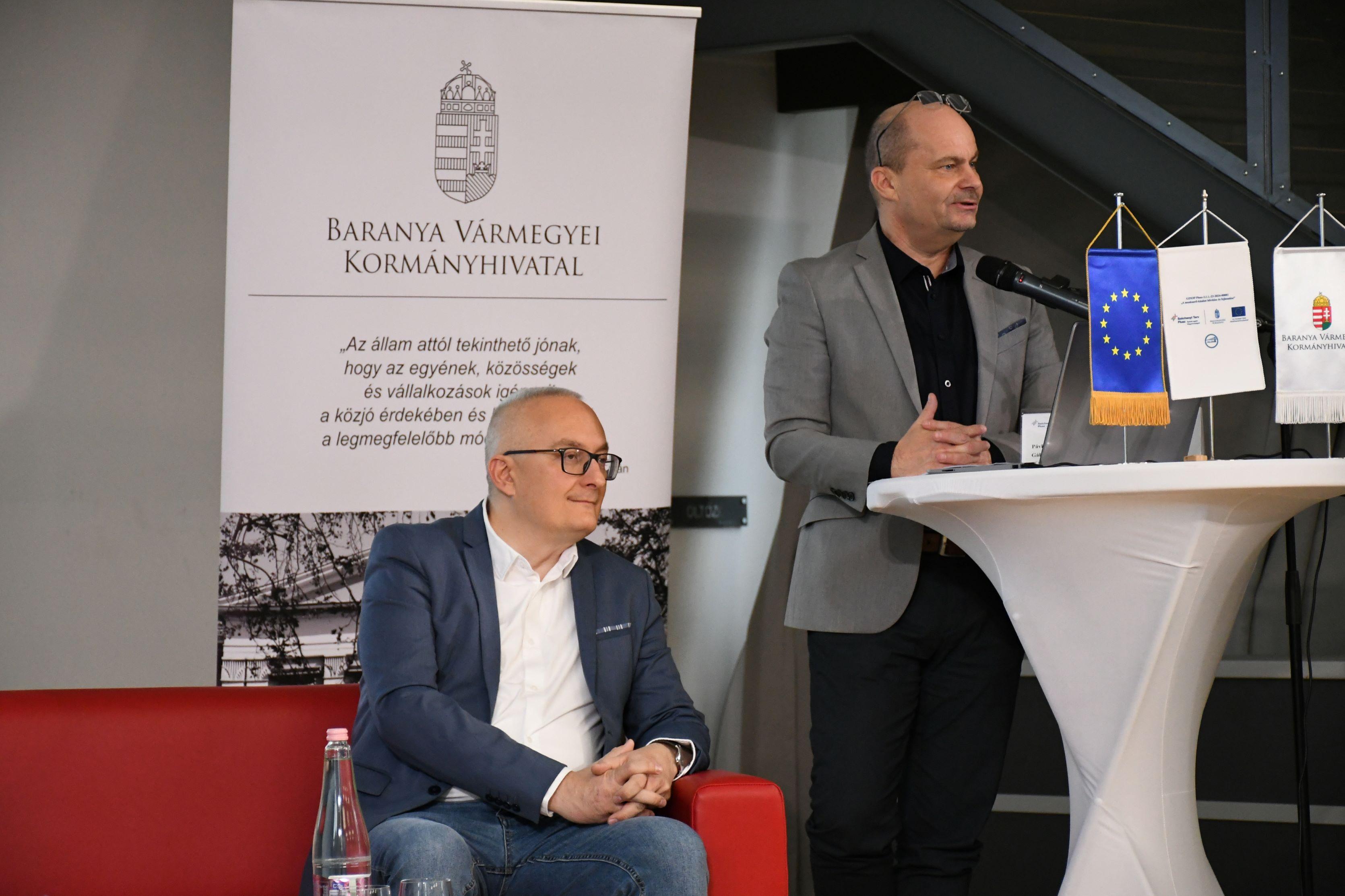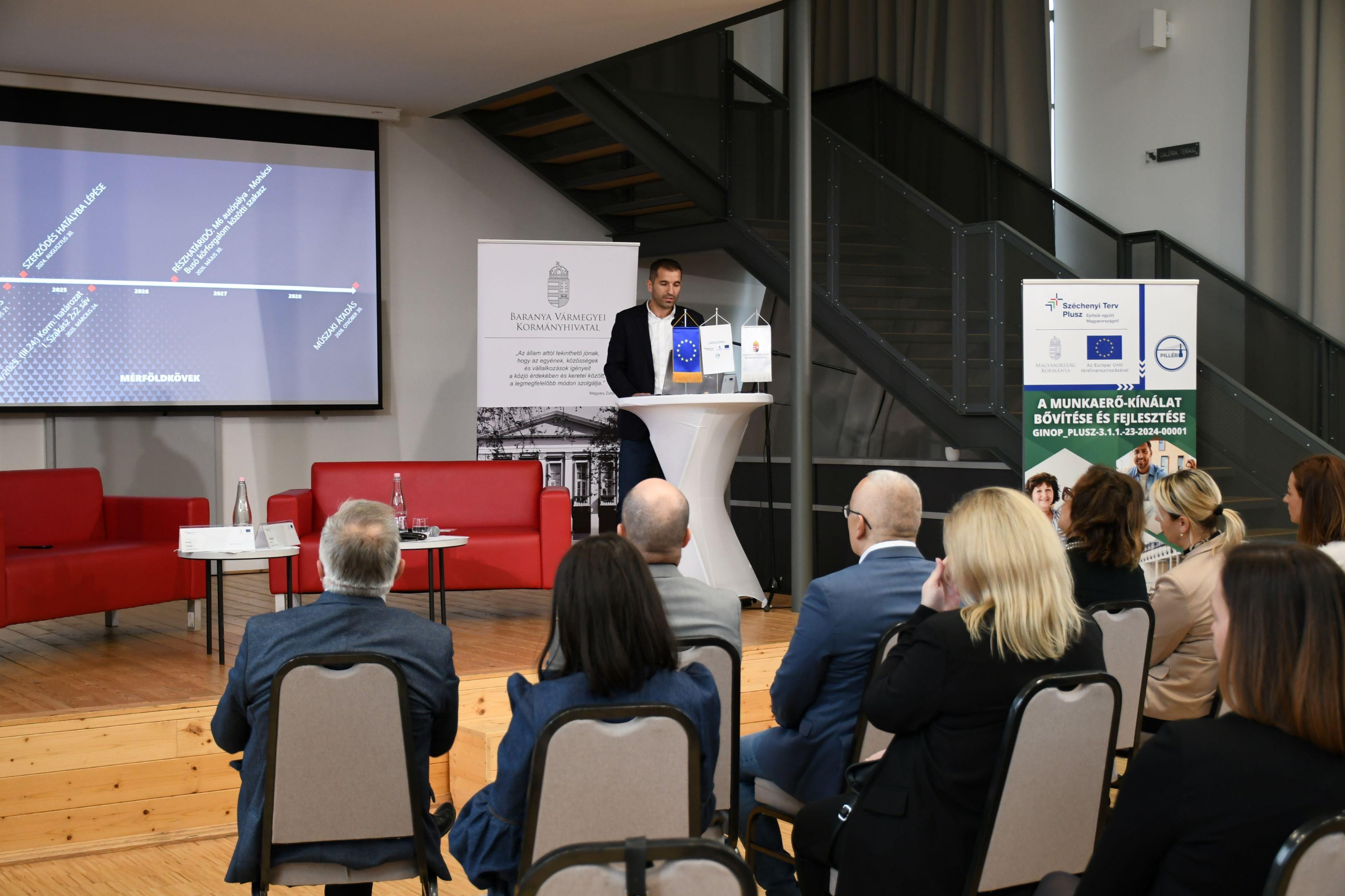 A beszélgetést dr. Horváth Zoltán főispán vezette, aki bevezetőjében bemutatta a Gazdaságfejlesztési és Innovációs Operatív Program Plusz, GINOP_PLUSZ-3.1.1-23-2024-00001 kódszámú „A munkaerő-kínálat bővítése és fejlesztése” elnevezésű – az Európai Unió támogatásával 2023. december 1. és 2027. augusztus 31. között, Baranyában 3,66 milliárd forintból megvalósuló – munkaerőpiaci programban elérhető, vissza nem térítendő támogatási lehetőségeket.