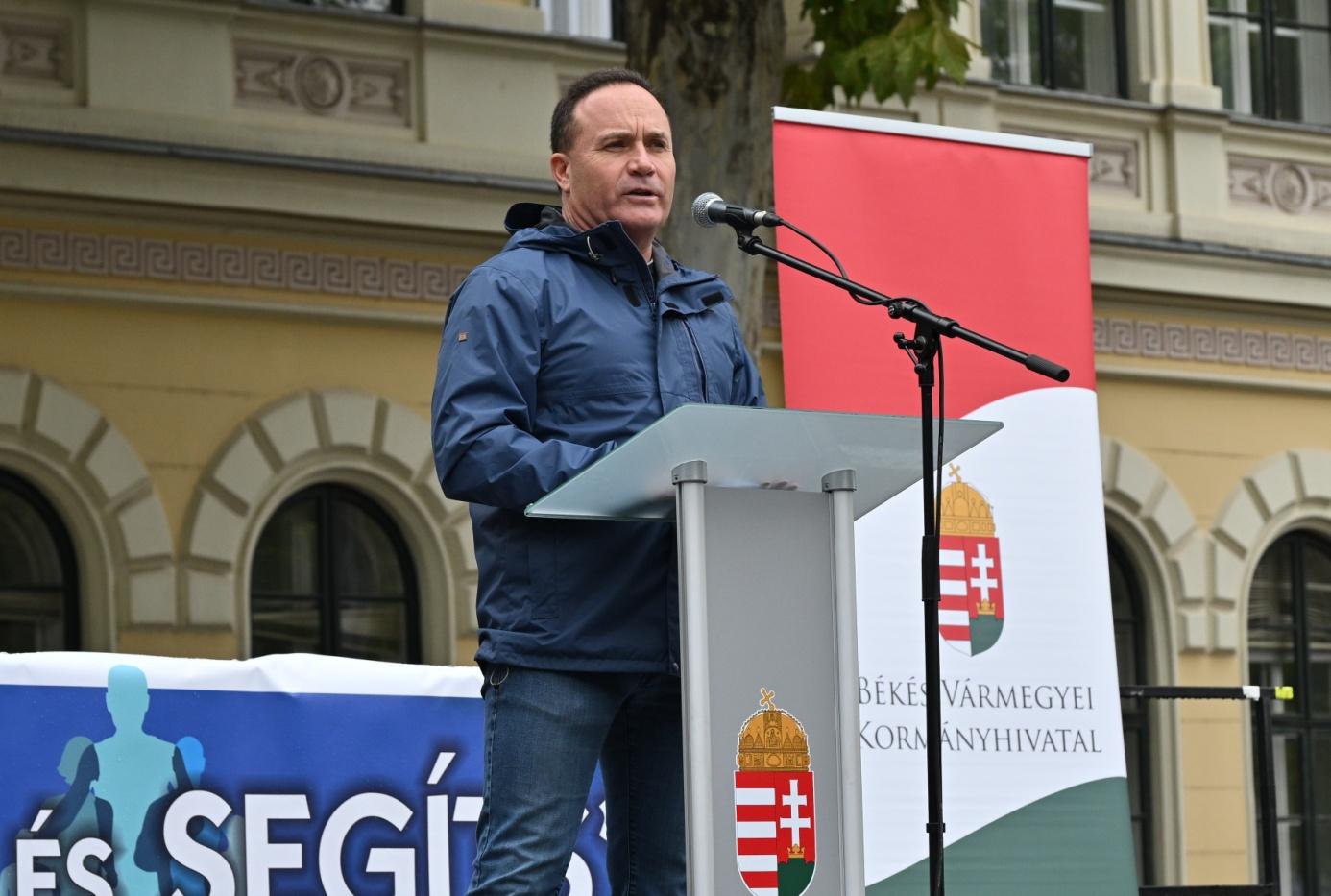 Nagyon örülök, hogy immár ötödik alkalommal találkoztunk, és idén is bővült a létszám, hiszen itt vannak a labdarúgók, a kézilabdások, a röplabdások, a kick-boxosok, a taekwondósok, az atletizálók, a fitneszesek, mindenki, aki számít. De leginkább azok számítanak, akik futnak, támogatják a futókat, tenni akarnak a jó cél, a nemes ügy érdekében – hangsúlyozta dr. Takács Árpád. A mai nap nemcsak a közösségről, sportról és egészséges életmódról szól, hanem az összetartozás érzéséről és az önzetlen segítségnyújtásról is, hiszen ismét a hátrányos helyzetű, nehéz sorsú gyermekeket támogatjuk elsősorban – húzta alá a főispán. Öt évvel ezelőtt volt egy jó receptünk: éspedig az, hogy a kormányhivatal válasszon egy nemes célt és kovácsoljon hozzá közösséget, sorsközösséget. Ez a közösség együtt van, évről-évre együtt fut, ez az új Békés vármegye egyik alappillére. A fiatalok, a generációk közötti együttműködés, a tenni akarás és az összetartozás. Ez a rendezvény a kormányhivatal, a Gál Ferenc Egyetem és az ÁGOTA® Alapítvány újabb közös szívdobbanása – tette hozzá dr. Takács Árpád, aki a kormánytisztviselőknek, a kormányhivatal dolgozóinak is köszönetet mondott az előkészítő munkáért.