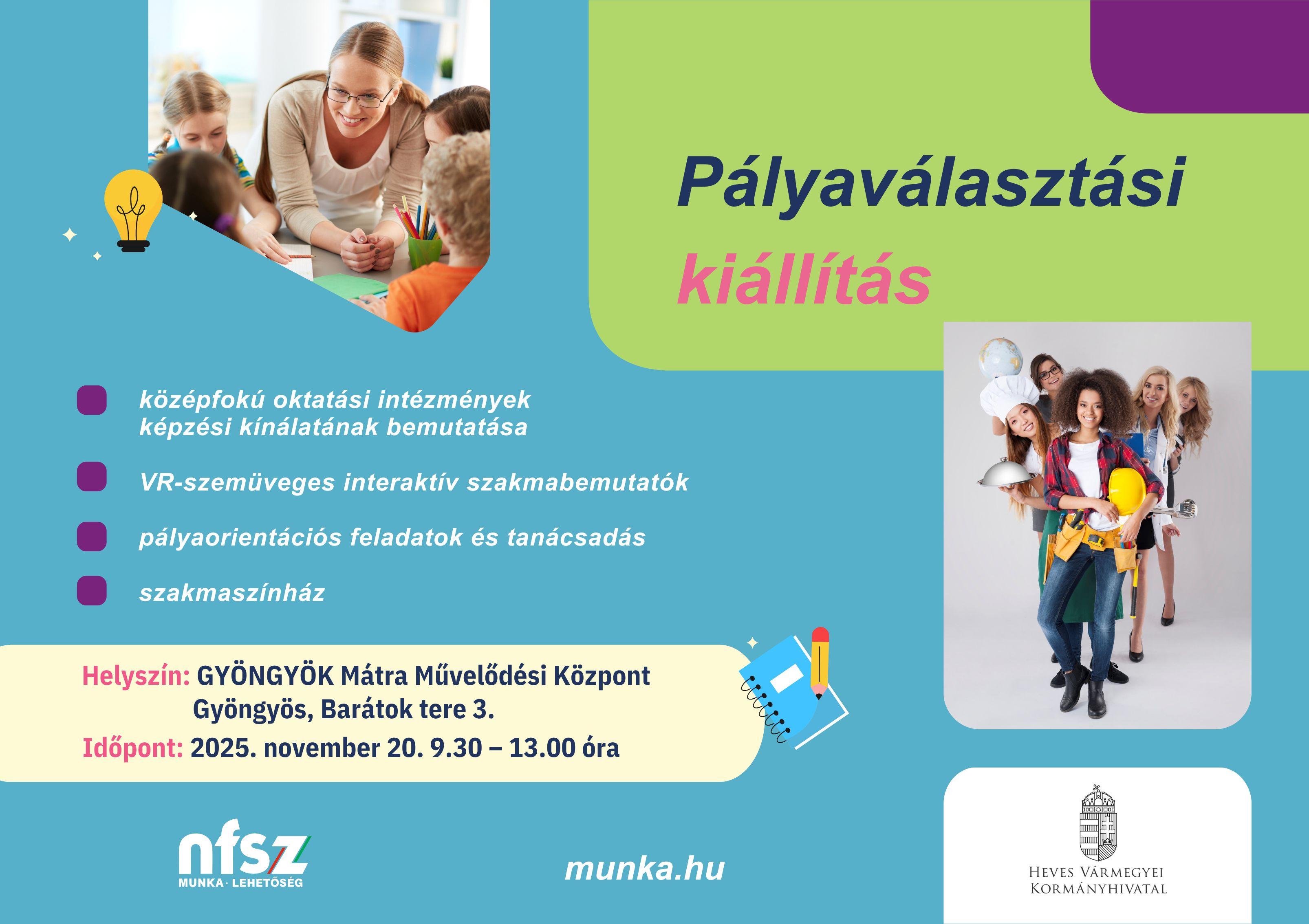 November 20-án, csütörtökön pályaválasztási kiállítást szervezünk Gyöngyösön, a GYÖNGYÖK Mátra Művelődési Központban. A rendezvényre az iskolaválasztás előtt álló 7. és 8. osztályos tanulókat várjuk a vármegye középfokú oktatási intézményeinek képzési kínálatával, látványos szakmabemutatókkal és pályaorientációs tanácsadással. Tizenöt középiskola mutatja be képzési kínálatát az eseményen.