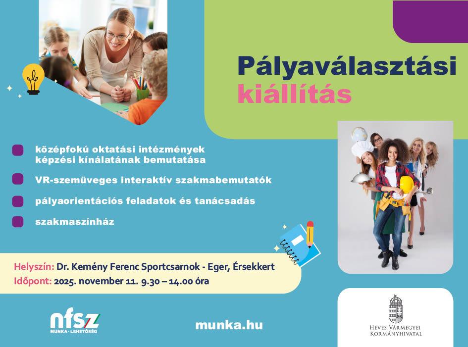 A Heves Vármegyei Kormányhivatal Pályaválasztási kiállítást szervez Egerben, a dr. Kemény Ferenc Sportcsarnokban. November 11-én, kedden 9 óra 30-tól délután 14 óráig várjuk az iskolaválasztás előtt álló 7. és 8. osztályos tanulókat a vármegye középfokú oktatási intézményeinek képzési kínálatával, látványos szakmabemutatókkal és pályaorientációs tanácsadással.