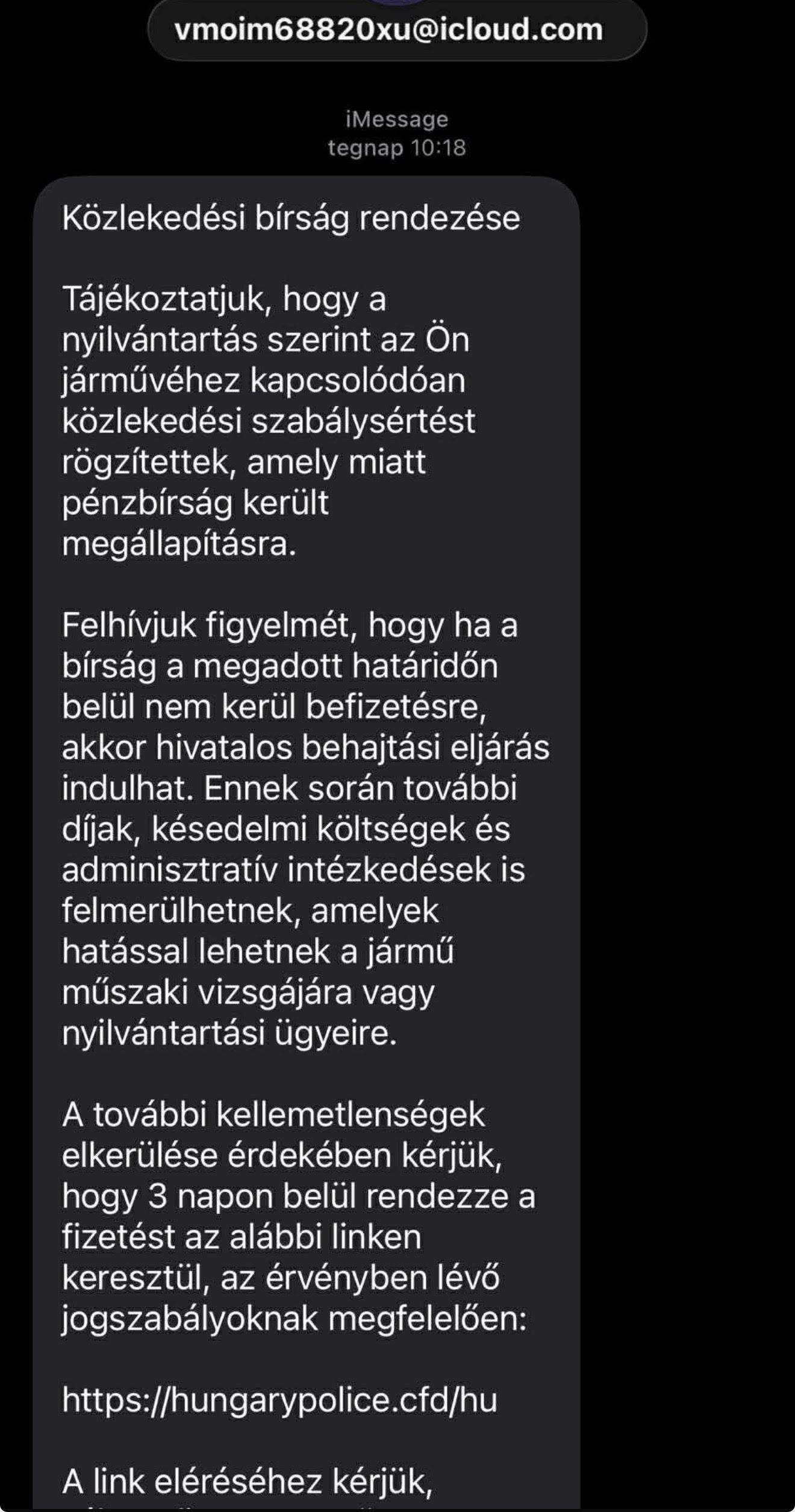 Ismeretlen feladók közlekedési bírság befizetését kérik egy megadott határidőn belül, amelyhez egy linket is mellékelnek.