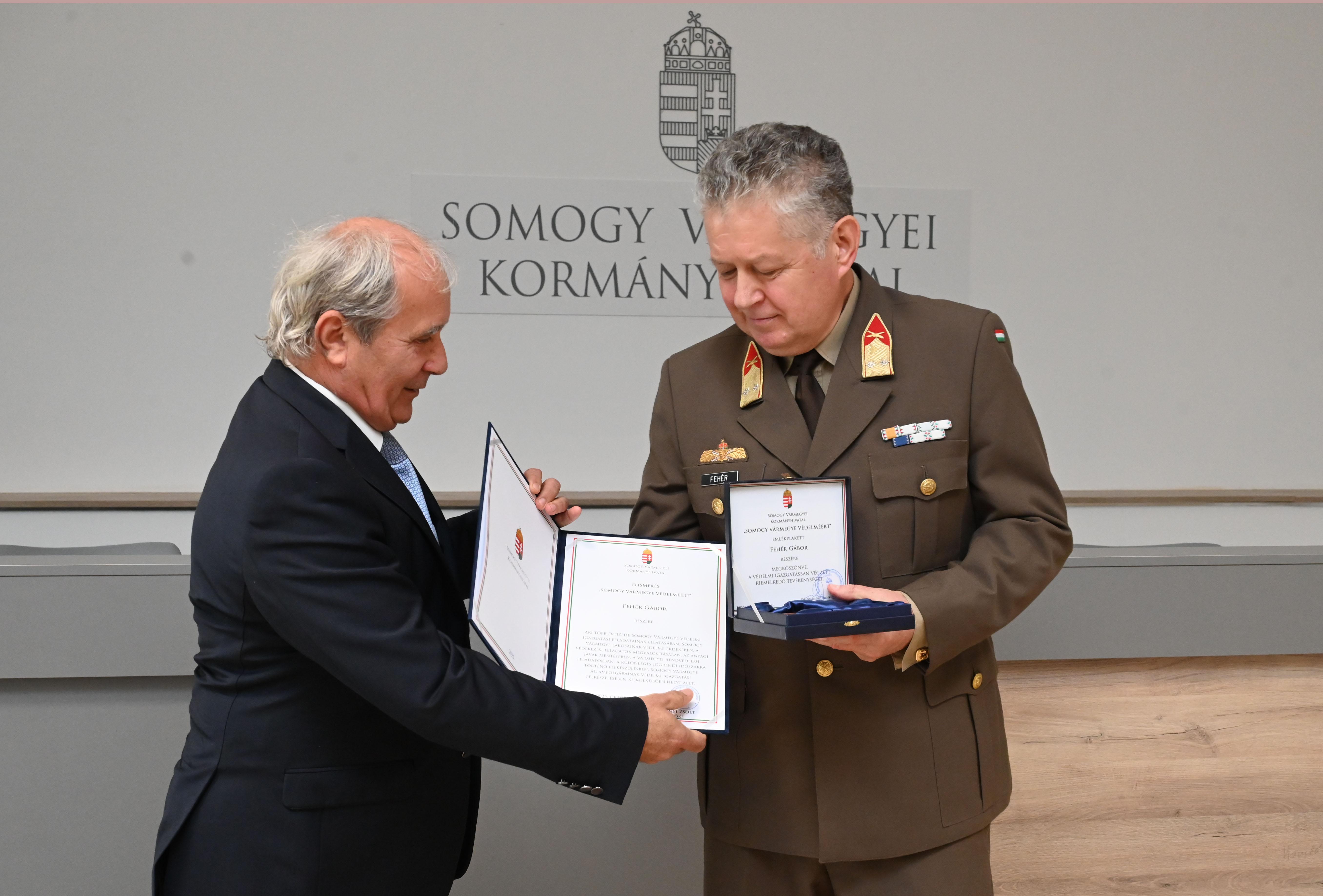 Fehér Gábor alezredes, a Somogy Vármegyei Területi Védelmi Bizottság titkára kapta 2025-ben a „Somogy Vármegye Védelméért Emlékplakett” elismerést.