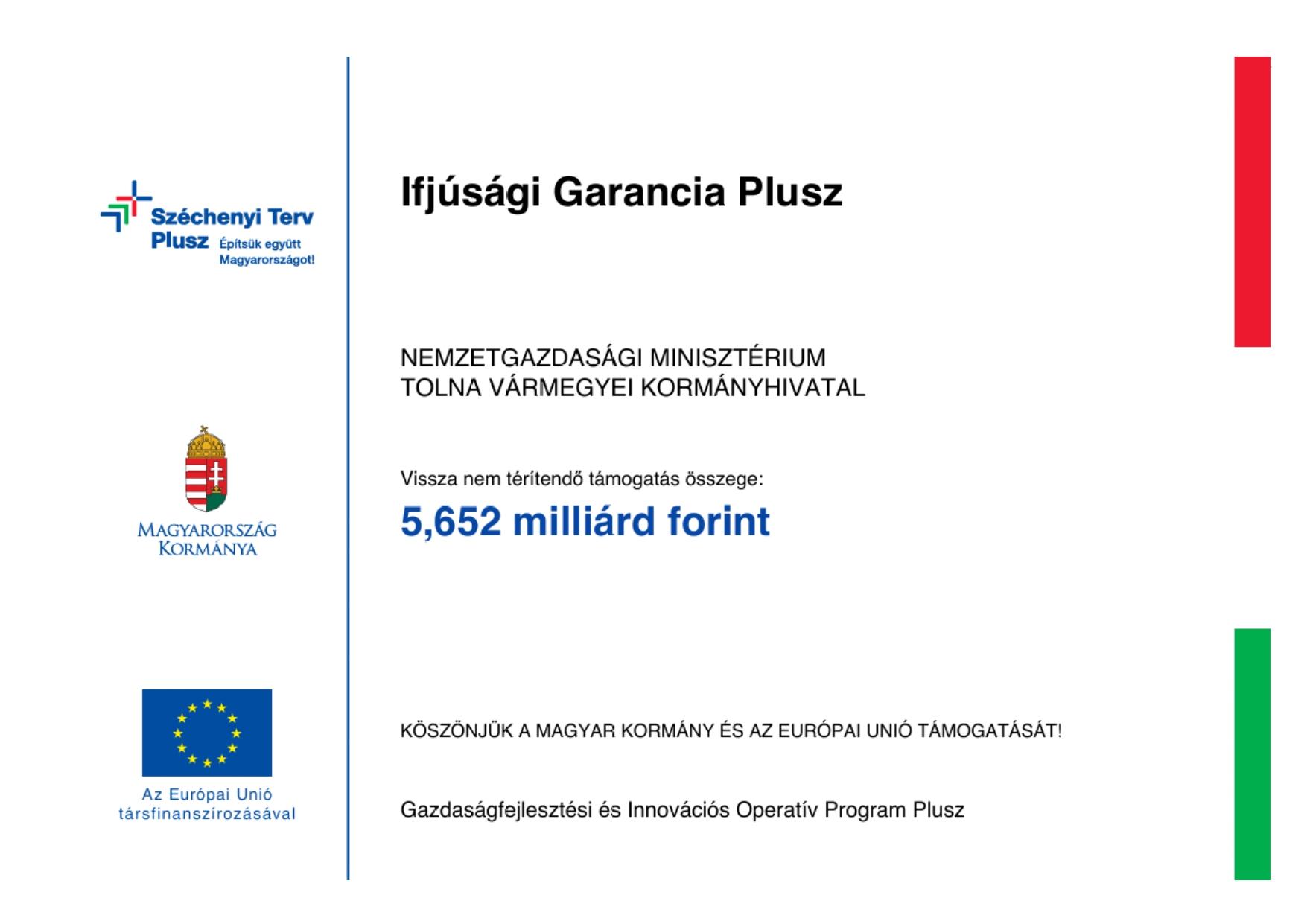 A GINOP_PLUSZ-4.1.1-23-2023-00001 kódszámú „Ifjúsági Garancia Plusz” elnevezésű - a Széchenyi Terv Plusz program keretében kiemelt fontosságú Pillérként az Európai Unió támogatásával és a magyar állam társfinanszírozásával megvalósuló – projekt célja, hogy azoknak a 15-29 év közötti fiataloknak a munkához, munkatapasztalathoz vagy piacképes tudáshoz jutását segítse, akik nem tanulnak, nem dolgoznak, emellett álláskeresőként vagy szolgáltatást kérőként nyilvántartásba vételüket kérték a lakóhelyük vagy tartózkodási helyük szerint illetékes járási hivatal foglalkoztatási osztályán.