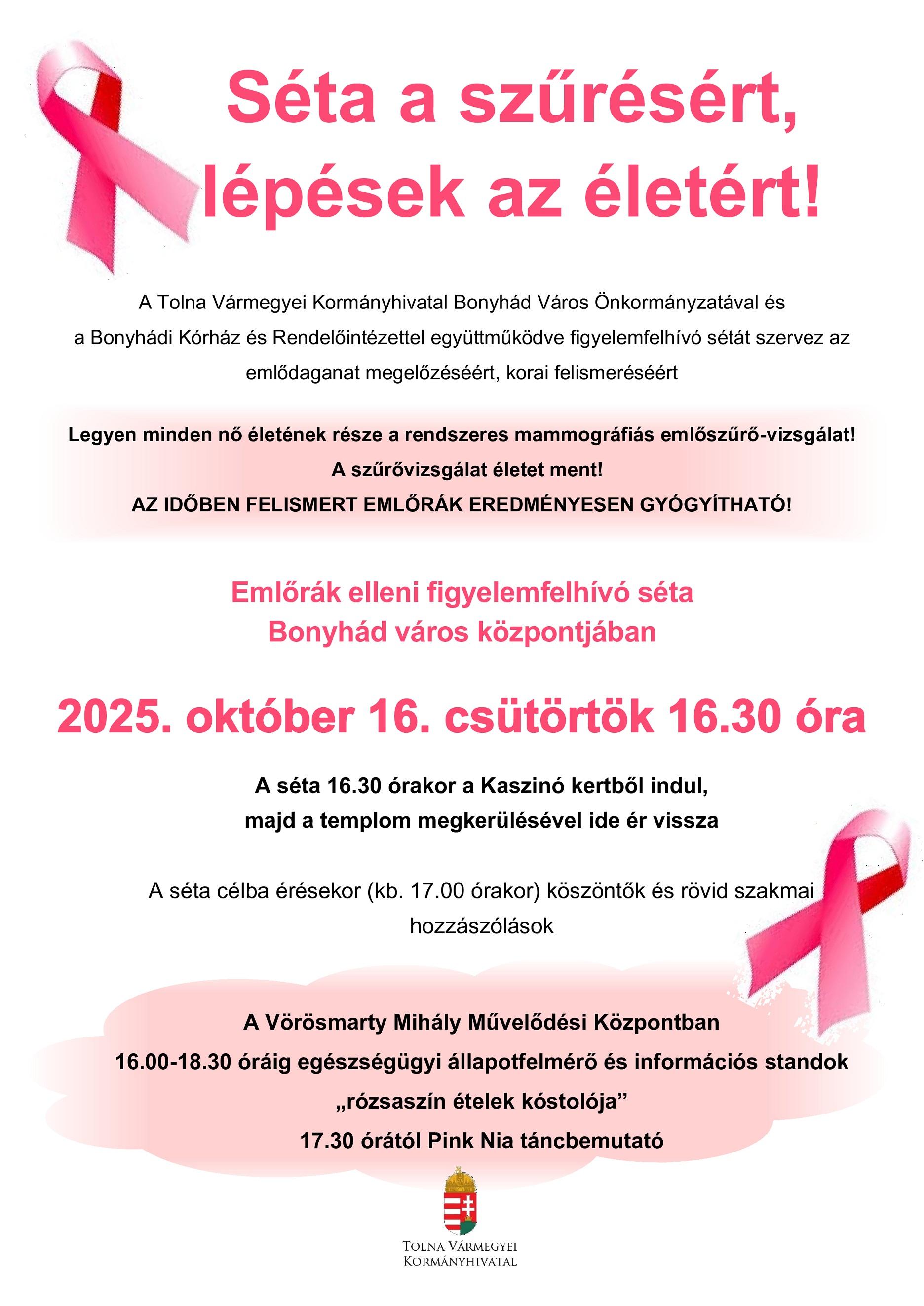 A mellrák elleni küzdelem kampányban a Tolna Vármegyei Kormányhivatal, Szekszárd Megyei Jogú Város Önkormányzatával, Bonyhád Város Önkormányzatával, a Tolna Vármegyei Balassa János Kórházzal, valamint a Bonyhádi Kórház és Rendelőintézettel együttműködve figyelemfelhívó sétát szervez Szekszárdon és Bonyhádon.