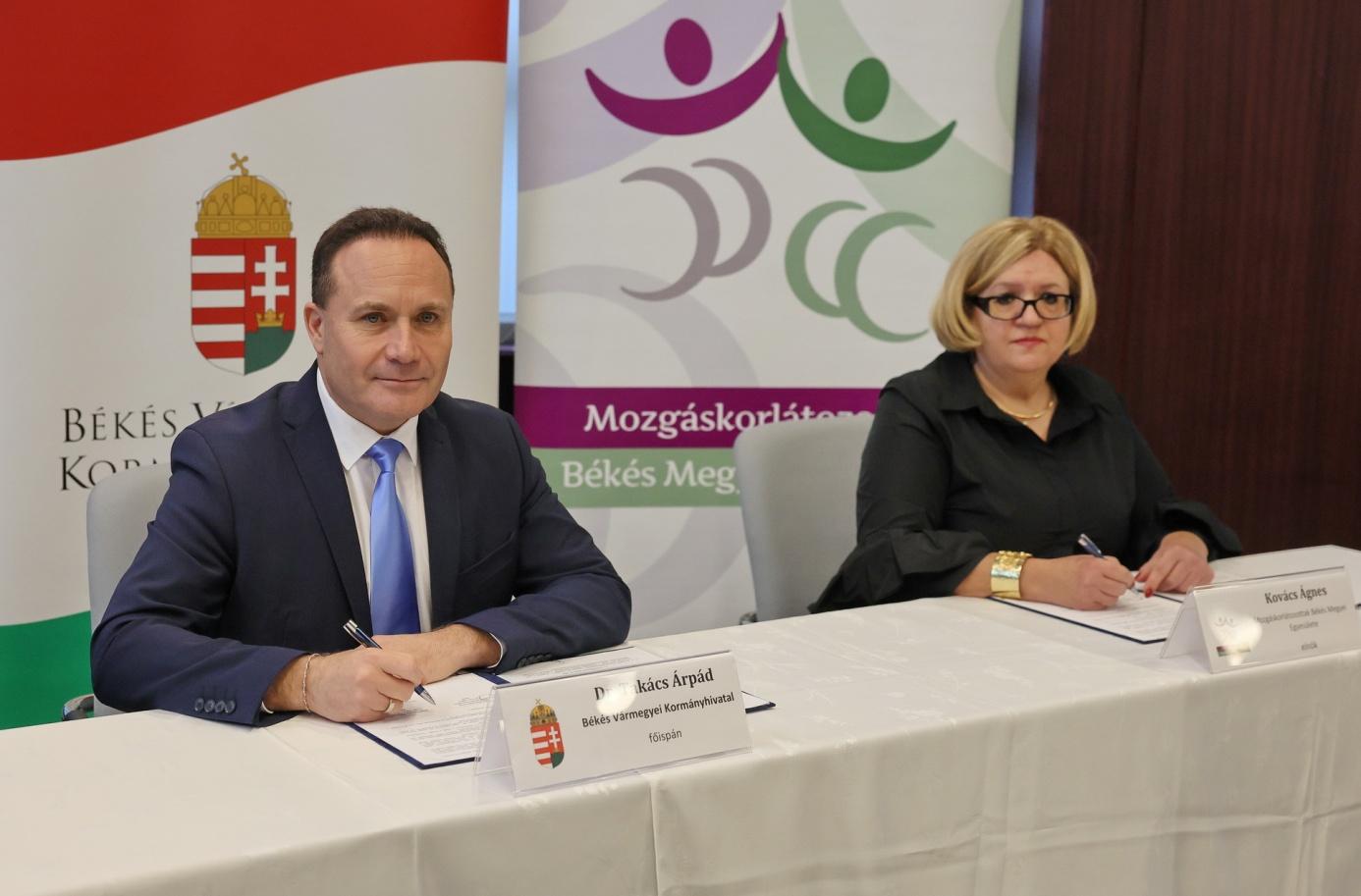A partnerségi szerződést dr. Takács Árpád főispán és Kovács Ágnes, a Mozgáskorlátozottak Békés Megyei Egyesülete elnöke látta el kézjegyével.