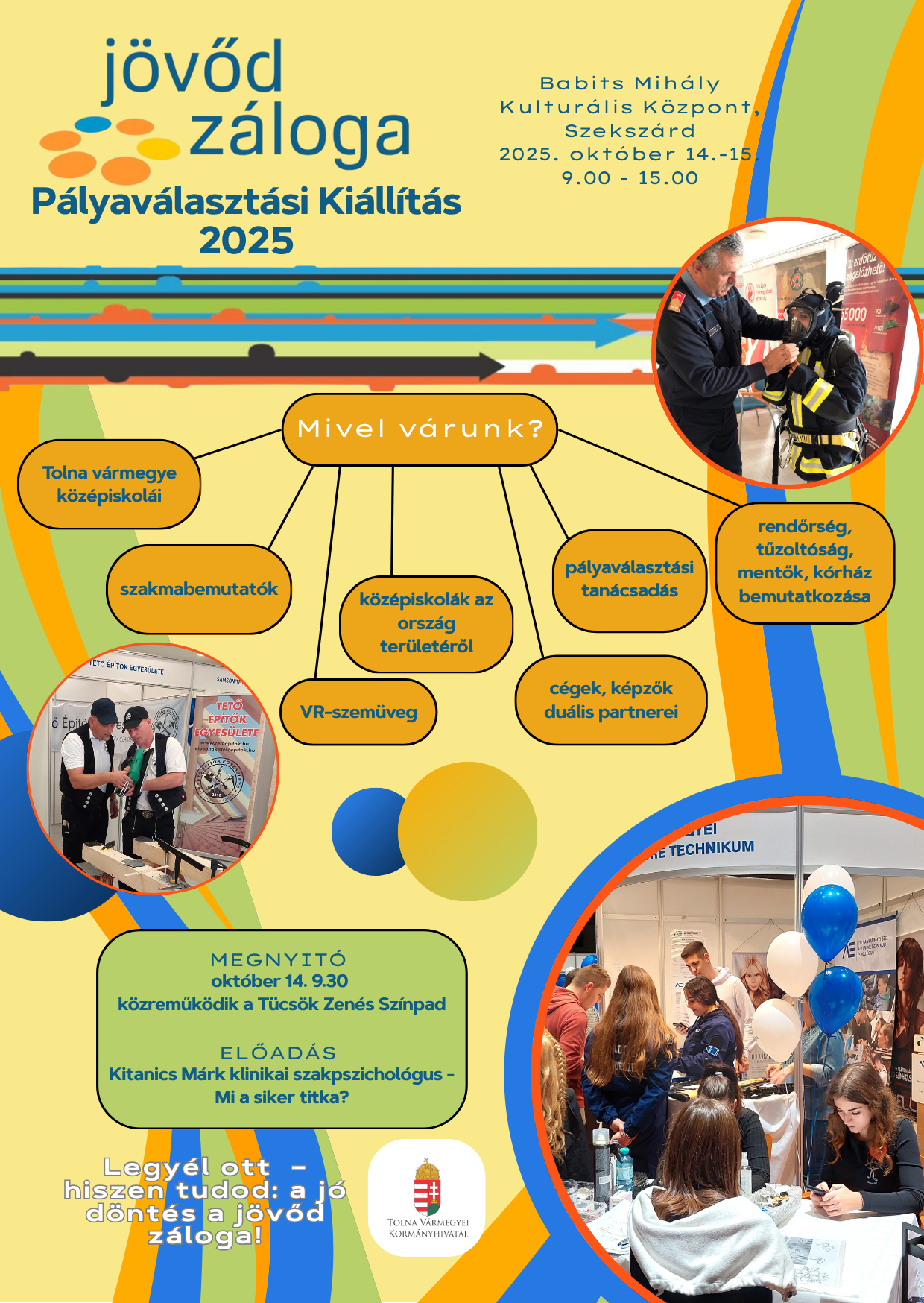 A Tolna Vármegyei Kormányhivatal idén 24. alkalommal rendezi meg a Jövőd Záloga Pályaválasztási Kiállítás elnevezésű programját. A rendezvénynek a szekszárdi Babits Mihály Kulturális Központ ad otthont 2025. október 14-15-én.