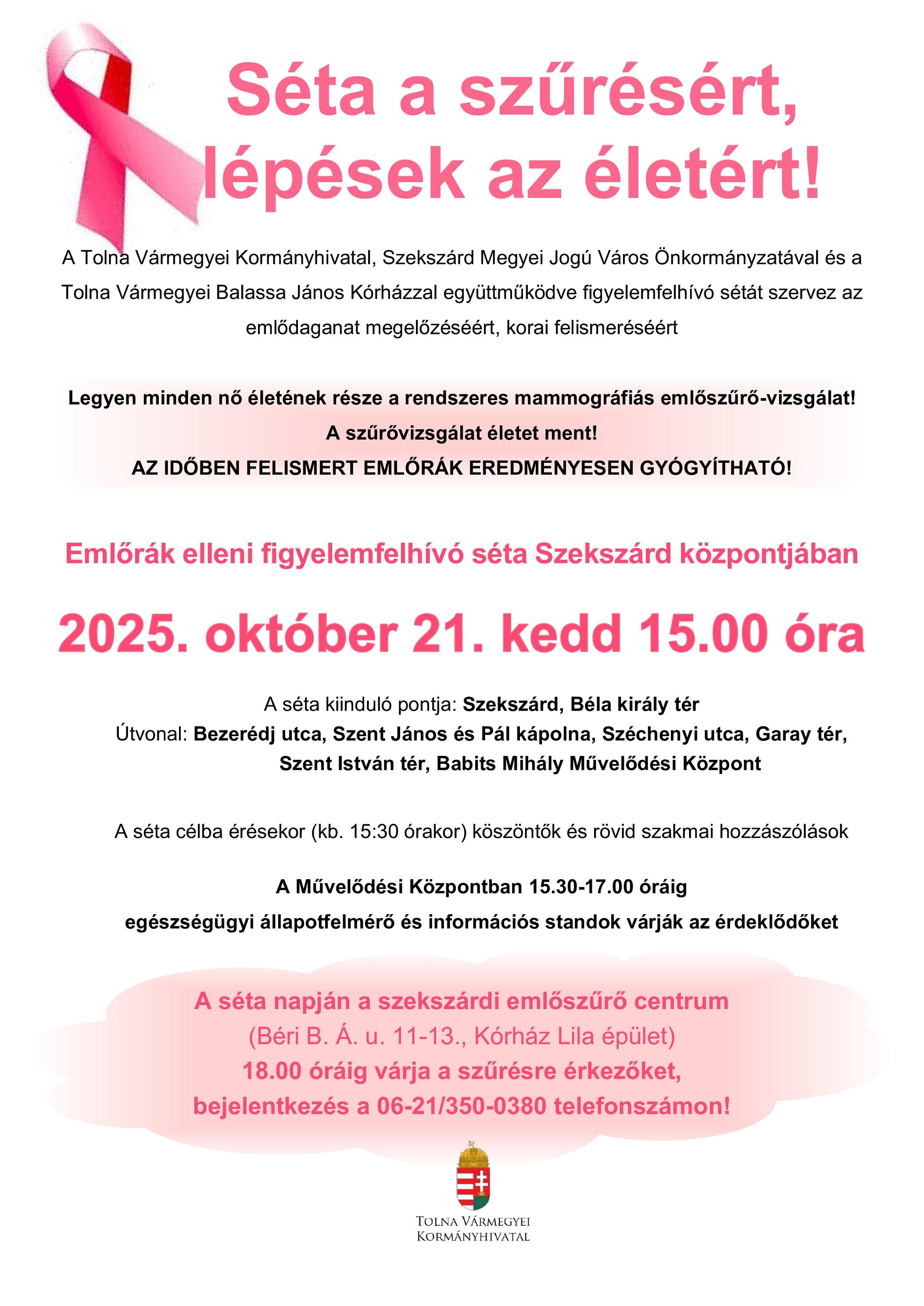 A Tolna Vármegyei Kormányhivatal figyelemfelhívó sétát szervez a mellrák elleni küzdelem hónapján.